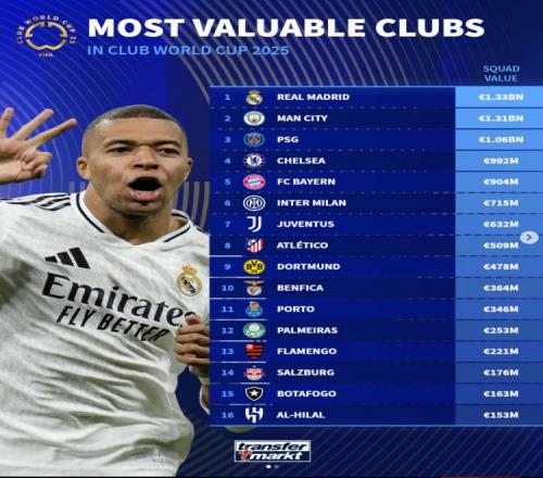 世俱杯各队身价排名:皇马13.3亿欧居首奥克兰城最低仅460万欧